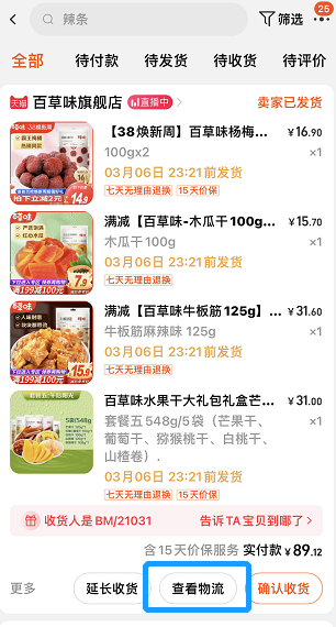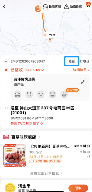 前往淘宝网页,点击商品的查看物流,复制快递号。
