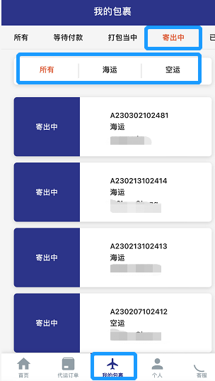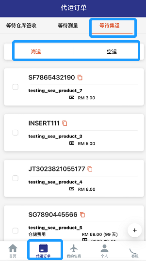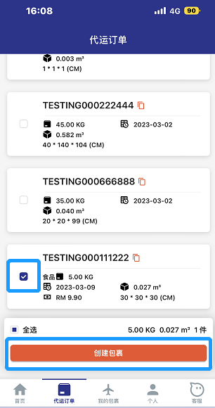 在 94Daiyun 的代运订单,查看等待集运。打勾 (√) 选择要邮寄的包裹。