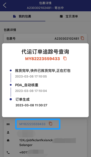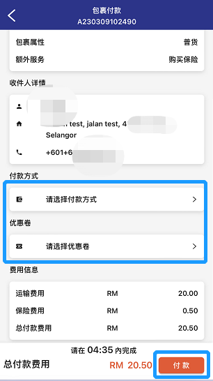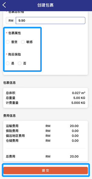 填写邮寄到马来西亚的收货地址,选择包裹属性与保险,最后点击提交且付款即可。